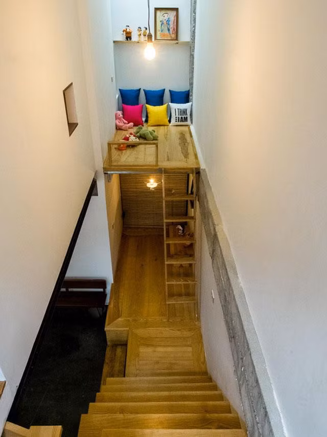 Một căn gác lửng nho nhỏ được bố trí làm chỗ chơi cho trẻ em. Đối diện đó là cầu thang dẫn lên khu vực nghỉ ngơi của cả gia đình.