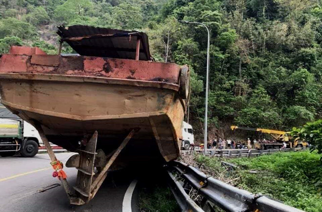 Thông tin ban đầu từ đơn vị quản lý đèo Bảo Lộc, khoảng 14 giờ ngày 4.5, chiếc xe đầu kéo mang BS 72C - 062.07 (chưa rõ danh tính tài xế điều khiển) kéo theo rơ - moóc chở chiếc thuyền “khủng” có chiều dài gần 30 mét, lưu thông trên Quốc lộ 20 theo hướng từ TP.HCM đi Đà Lạt.