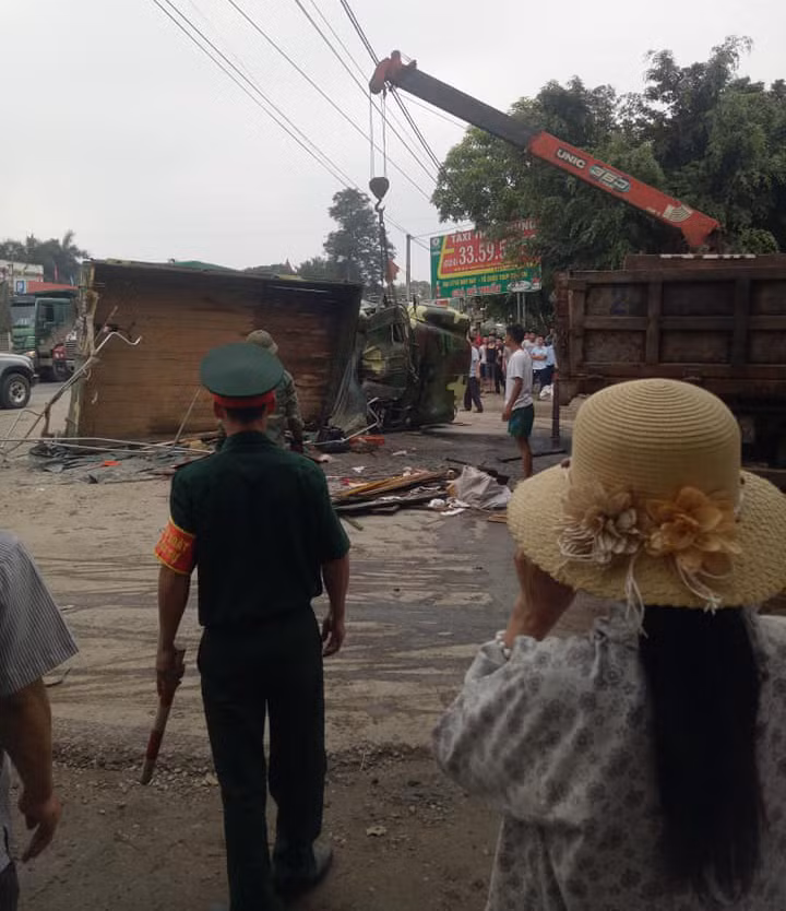 Tại hiện trường xe quân sự bị lật ngửa, phần đầu xe và thùng xe vỡ nát, các mảnh vỡ của xe cùng khí tài quân sự nằm rải rác trên mặt đường.