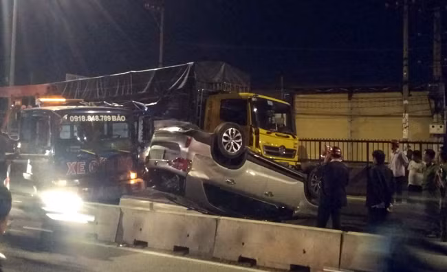 Tại hiện trường, xe ô tô 7 chỗ nằm lật ngửa trước đầu xe tải chắn ngang hết làn đường xe ô tô, toàn bộ kính xe bị vỡ, xe bị móp méo hư hỏng nặng. Vụ tai nạn khiến giao thông qua khu vực bị ùn tắc kéo dài, các phương tiện phải lưu thông vào làn xe máy.
