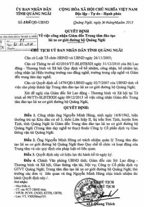 Đáng lưu ý, chức danh Giám đốc Trung tâm đào tạo lái xe cơ giới đường bộ Quảng Ngãi được Chủ tịch UBND tỉnh Quảng Ngãi ký quyết định, do cơ quan Sở LĐTB&XH tỉnh đề nghị. Đồng thời, qua mặt đơn vị Sở GTVT tỉnh Quảng Ngãi trong quá trình đào tạo lái xe và cấp bằng cho học viên.