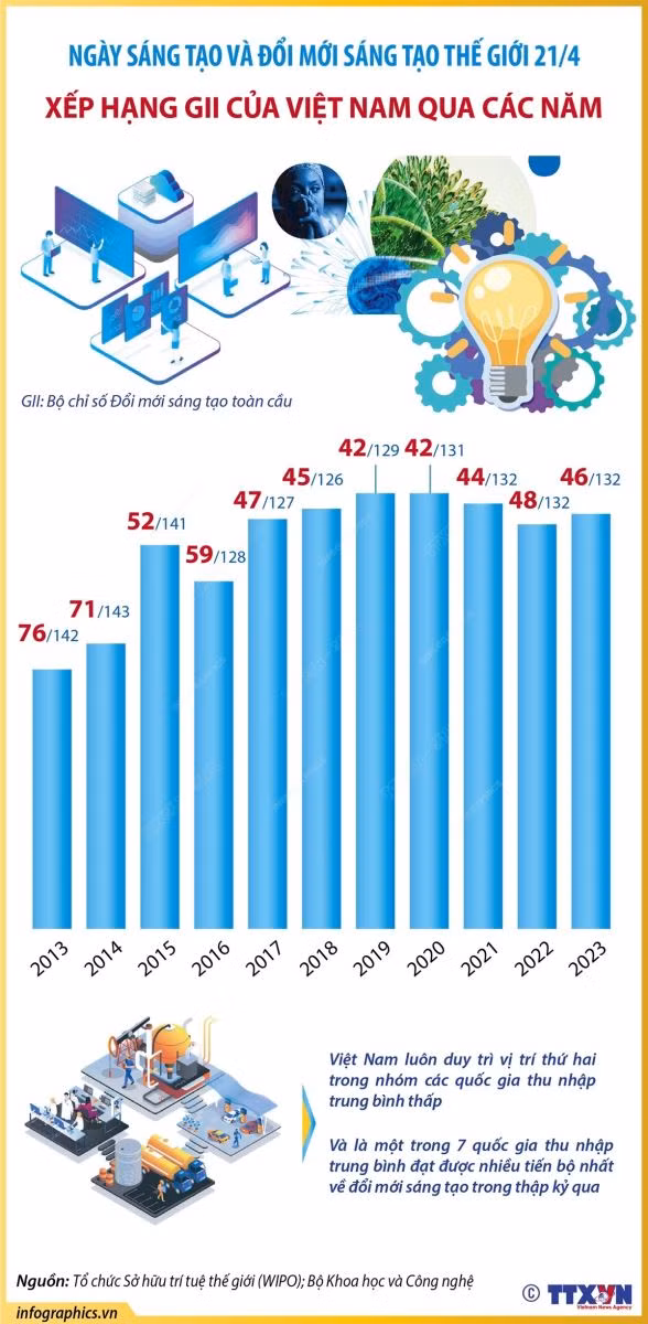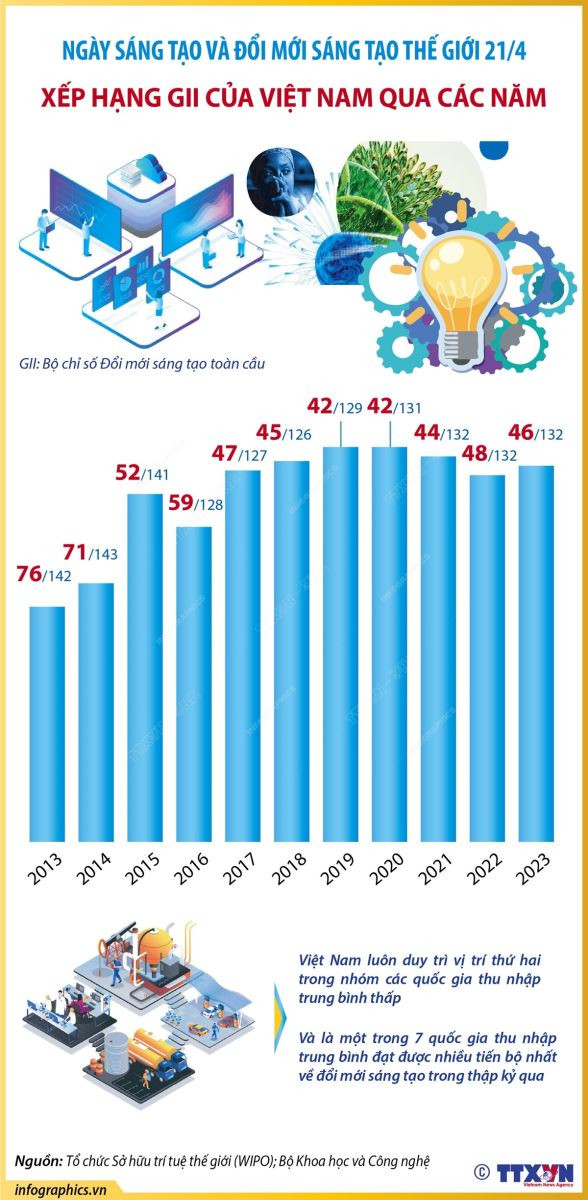 Tổ chức Sở hữu trí tuệ thế giới công bố Bộ chỉ số Đổi mới sáng tạo toàn cầu (thường được gọi tắt là GII). Từ 2017 đến nay, Bộ Chỉ số GII của Việt Nam liên tục được cải thiện (tăng từ vị trí 59 năm 2016 lên vị trí 46 năm 2023). Việt Nam luôn duy trì vị trí thứ hai trong nhóm các quốc gia thu nhập trung bình thấp và là một trong 7 quốc gia thu nhập trung bình đạt được nhiều tiến bộ nhất về đổi mới sáng tạo trong thập kỷ qua.