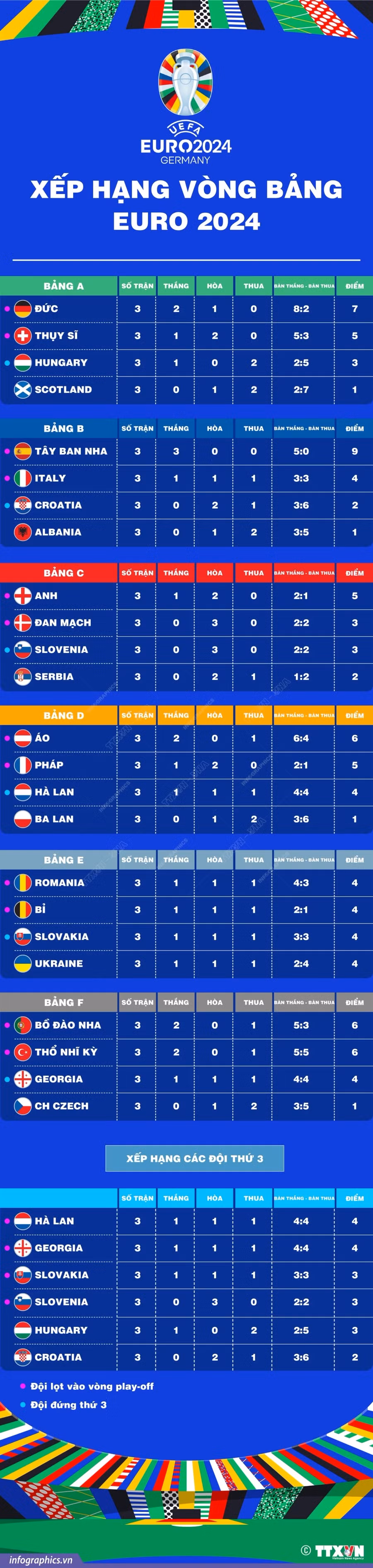 Sau giai đoạn vòng bảng nhiều kịch tính, 16 đội vào vòng 1/8 EURO 2024 đã được xác định, gồm: Đức, Thụy Sĩ (bảng A), Tây Ban Nha, Italy (bảng B), Anh, Đan Mạch, Slovenia (bảng C), Áo, Pháp, Hà Lan (bảng D), Romania, Bỉ và Slovakia (bảng E), cùng Bồ Đào Nha, Thổ Nhĩ Kỳ và Gruzia (bảng F).