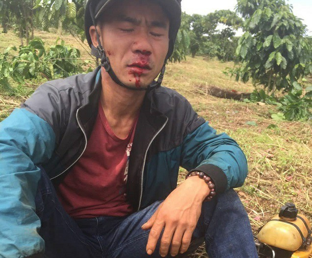 3 người đàn ông thuê hơn 20 người đến lô đất đang tranh chấp để thu hoạch cà phê. Khi bị anh Cẩn ngăn cản, nhóm này đã đánh anh Cẩn chảy máu mũi.