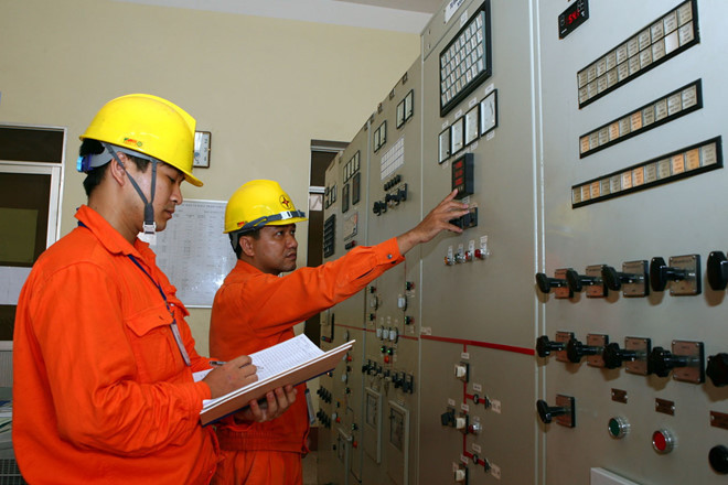Công nhân trực ca đêm theo dõi hoạt động của các thiết bị tại Nhà máy Thủy điện An Khê. Ảnh: Văn Cường