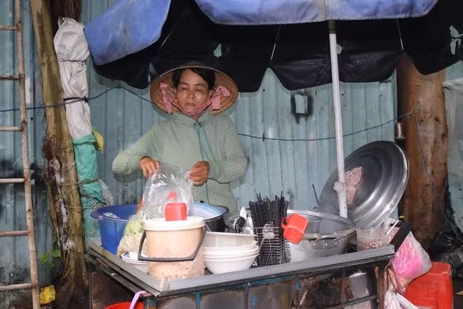 Nằm trong một con hẻm trên đường 3 Tháng 2 (Q.10), chúng tôi gặp một người phụ nữ với dáng người nhỏ nhắn, tóc đã bạc và đôi mắt rất buồn. Vừa thái thịt thành những lát mỏng, bàn tay bà nhanh thoăn thoắt trụng hủ tiếu, chan thêm nước dùng đậm đà. Chúng tôi hỏi, bà nói tên Ba (59 tuổi, quê ở H.Mộ Đức, Quảng Ngãi).