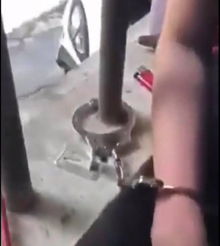 Hình ảnh cô gái bị còng tay vào cửa sổ - Ảnh cắt từ video clip