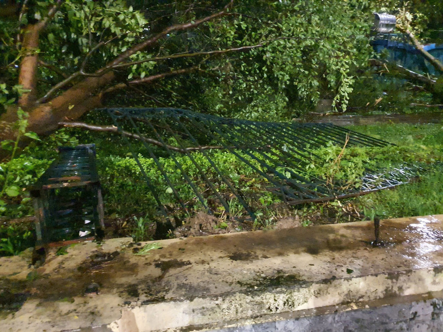 | Cây lớn còn đổ đè lên bốt trực trong công viên. |