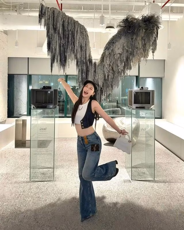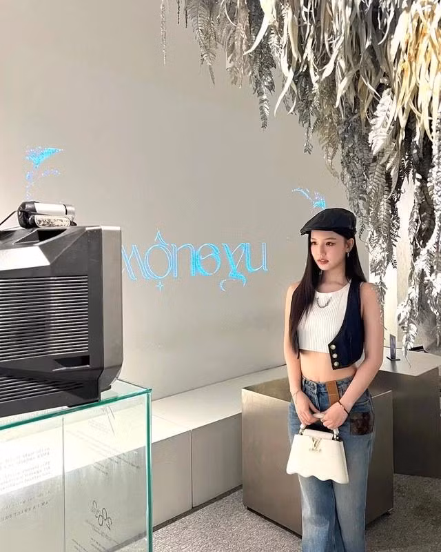 Amee vô cùng tinh tế khi lựa chọn chiếc áo ghi lê denim crop top không chỉ giúp tôn lên vòng eo mà còn tạo cảm giác năng động. Kết hợp cùng là áo tank top trắng đơn giản bên trong, giúp làm sáng tổng thể và tạo sự cân đối với màu sắc của denim.