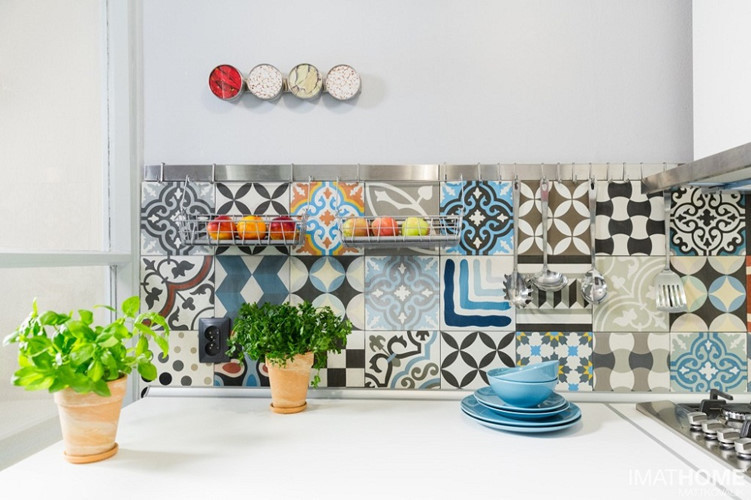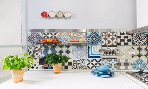 Gạch bông ốp tường giúp không gian nhà bếp thêm tươi sáng.