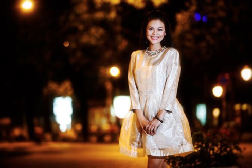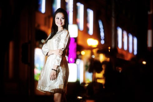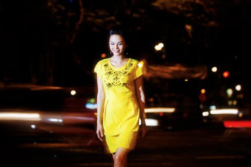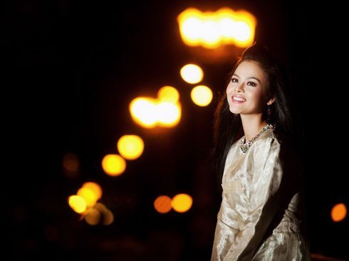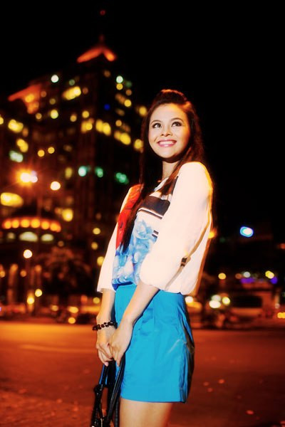 Người đẹp của làng phim truyền hình, kịch nói TP. HCM thể hiện hình ảnh cô gái trẻ háo hức đợi người yêu trên phố đêm đèn vàng.
