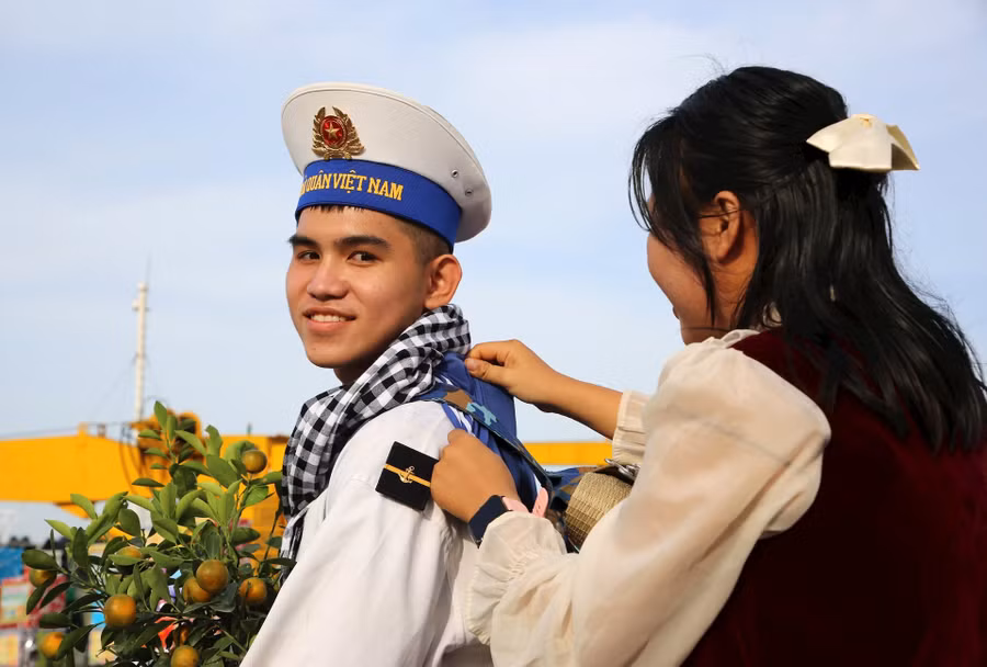 Nắng xuân rạo rực trên bến, đoàn tàu chuẩn bị rời đi, cô gái trẻ Lê Thị Quỳnh Như bất ngờ lấy từ trong túi xách chiếc khăn rằn gửi tặng người yêu. Quỳnh Như nói, đó là món quà kỷ niệm mà cô muốn gửi tặng, như lời nhắn nhủ người yêu yên tâm công tác, hoàn thành tốt nhiệm vụ. “Đây là lần thứ 2 em tiễn bạn ấy lên đường làm nhiệm vụ. Lần trước là đợt giao nhận quân, lần này thì khác hơn một chút, vì nhiệm vụ của bạn ở biển, cùng đồng đội góp sức bảo vệ chủ quyền nên sẽ rất nhớ” - Quỳnh Như bẽn lẽn nép sau lưng bạn trai, tâm sự.