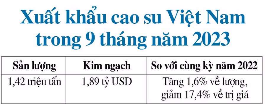 ƯTheo qdnd.vn, giá xuất khẩu cao su bình quân trong 9 tháng năm 2023 đạt 1.283 USD/tấn (giảm 11,2% so với cùng kỳ năm 2022).