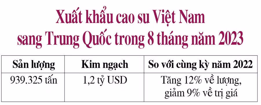 Đáng chú ý trong 8 tháng qua, Trung Quốc đang tăng mạnh nhập khẩu mặt hàng này từ Việt Nam. Cụ thể trong tháng 8-2023, xuất khẩu cao su sang thị trường này đạt 181.723 tấn, trị giá hơn 232,04 triệu USD (tăng 11% về lượng nhưng giảm 4% về trị giá so với tháng 8-2022). Tính chung 8 tháng năm 2023, xuất khẩu mặt hàng này sang Trung Quốc đã giúp Việt Nam thu về hơn 1,2 tỷ USD (939.325 tấn, tăng 12% về lượng nhưng giảm 9% về trị giá so với cùng kỳ năm 2022).
