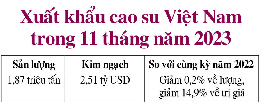 Theo thoibaotaichinhvietnam.vn, giá xuất khẩu cao su bình quân tháng 11-2023 đạt 1.370 USD/tấn (tăng 1,8% so với tháng 10-2023 và tăng 1% so với tháng 11-2022). Hiệp hội Cao su Việt Nam nhận định, với mức giá như hiện tại, kim ngạch xuất khẩu cao su năm 2023 khó có thể đạt được mục tiêu 3,5 tỷ USD đã đề ra.