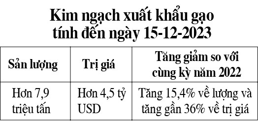 Tính chung từ đầu năm đến ngày 15-12-2023, cả nước xuất khẩu hơn 7,9 triệu tấn gạo, trị giá hơn 4,5 tỷ USD (tăng 15,4% về lượng, tăng gần 36% về trị giá so với cùng kỳ năm 2022).