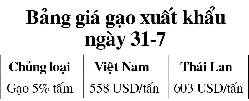 Tương tự, gạo 5% tấm xuất khẩu của Thái Lan vọt lên ngưỡng 603 USD/tấn (tăng 62 USD); gạo 25% tấm tăng 51 USD lên mức 553 USD/tấn so với ngày 19-7 (tăng 42,2% so với cùng kỳ năm 2022).