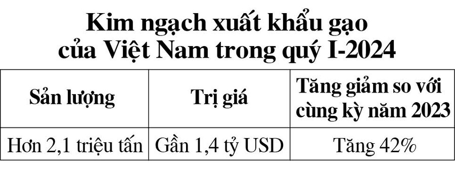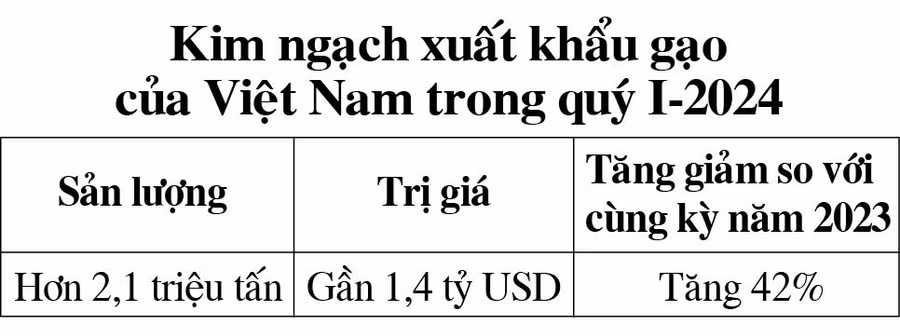 Theo Hiệp hội Lương thực Việt Nam, năm 2023, xuất khẩu gạo cả nước đạt mức cao kỷ lục 8,13 triệu tấn, trị giá 4,7 tỷ USD. Năm nay, Việt Nam đặt mục tiêu xuất khẩu gạo đạt 5 tỷ USD. Hiện Việt Nam đứng thứ 3 trên thế giới về xuất khẩu gạo (sau Ấn Độ và Thái Lan).