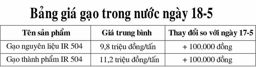 Cụ thể, sau khi điều chỉnh, giá gạo nguyên liệu IR 504 ở mức 9,8 triệu đồng/tấn; gạo thành phẩm IR 504 ở mức 11,2 triệu đồng/tấn.