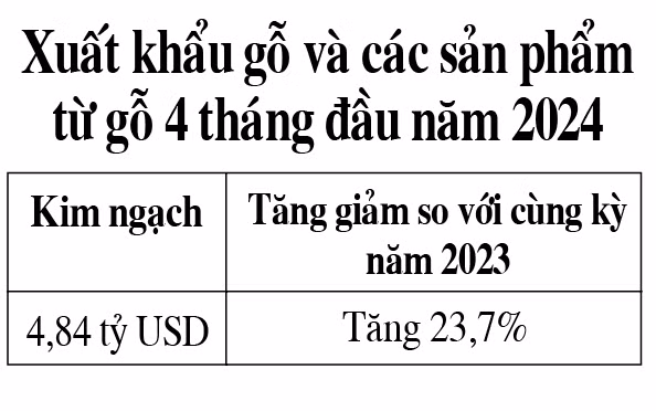 Lũy kế 4 tháng đầu năm 2024, xuất khẩu gỗ và sản phẩm từ gỗ của Việt Nam đạt 4,84 tỷ USD (tăng 23,7% so với cùng kỳ năm 2023).