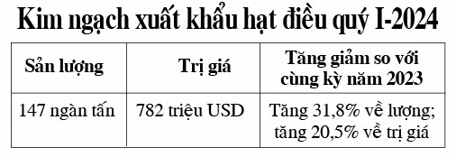 Tính chung cả quý I-2024, Việt Nam đã xuất khẩu khoảng 147 ngàn tấn hạt điều, trị giá 782 triệu USD (tăng 31,8% về lượng và tăng 20,5% về trị giá so với cùng kỳ năm 2023).