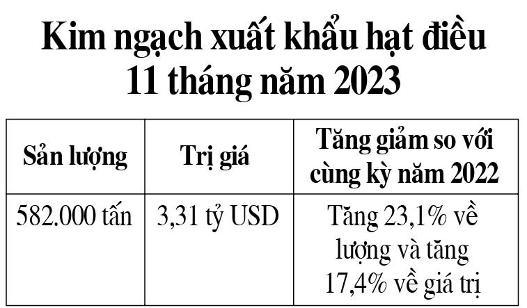 Tính chung 11 tháng năm 2023, nước ta đã xuất khẩu 582.000 tấn hạt điều, trị giá 3,31 tỷ USD (tăng 23,1% về lượng và tăng 17,4% về trị giá so với cùng kỳ năm 2022).