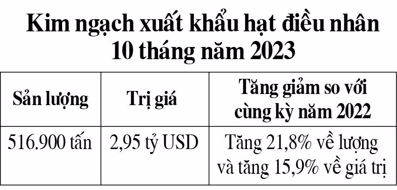 Tính chung 10 tháng năm 2023, nước ta đã xuất khẩu 516.900 tấn hạt điều nhân, trị giá 2,95 tỷ USD (tăng 21,8% về lượng và tăng 15,9% về giá trị so với cùng kỳ năm 2022).