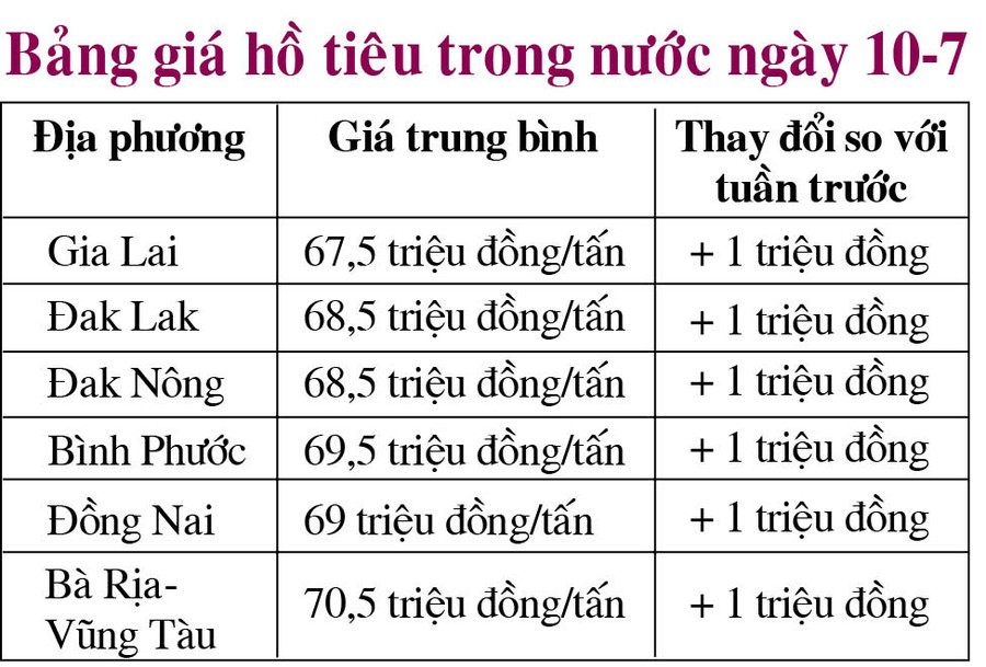 Trong khi đó, hồ tiêu tại tỉnh Đồng Nai và Bình Phước lần lượt có giá 69 triệu đồng/tấn và 69,5 triệu đồng/tấn.