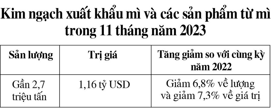 Lũy kế 11 tháng năm 2023, xuất khẩu mì và các sản phẩm từ mì đạt gần 2,7 triệu tấn, trị giá 1,16 tỷ USD (giảm 6,8% về lượng và giảm 7,3% về trị giá so với cùng kỳ năm 2022).