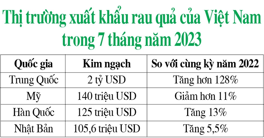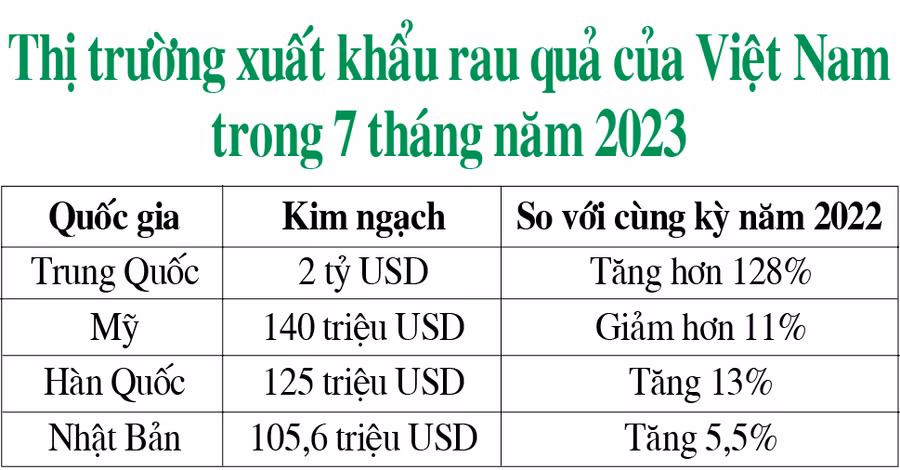 Cục Xuất nhập khẩu (Bộ Công thương) cho hay, Trung Quốc là thị trường dẫn đầu kim ngạch nhập khẩu rau quả Việt. 7 tháng năm 2023, xuất khẩu rau quả sang quốc gia này đạt 2 tỷ USD (tăng hơn 128% so với cùng kỳ năm 2022). Tiếp theo là xuất khẩu thị trường Mỹ đạt trên 140 triệu USD (giảm hơn 11% so với cùng kỳ năm 2022); Hàn Quốc đạt 125 triệu USD (tăng 13% so với cùng kỳ năm 2022); Nhật Bản đạt 105,6 triệu USD (tăng 5,5% so với cùng kỳ năm 2022)...