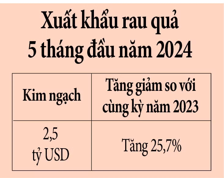 Tính chung 5 tháng đầu năm 2024, kim ngạch xuất khẩu rau quả của Việt Nam đạt 2,5 tỷ USD (tăng 25,7% so với cùng kỳ năm 2023).