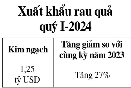 Tính chung 3 tháng đầu năm 2024, kim ngạch xuất khẩu rau quả của Việt Nam đạt 1,25 tỷ USD (tăng 27% so với cùng kỳ năm 2023). Đây là lần đầu tiên xuất khẩu rau quả của Việt Nam đạt và vượt 1 tỷ USD ngay trong quý đầu tiên của năm.