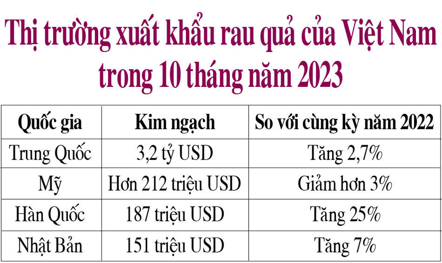 Theo Báo Công thương, hiện Trung Quốc là quốc gia nhập rau quả Việt Nam nhiều nhất với tổng kim ngạch 10 tháng đạt 3,2 tỷ USD (tăng 2,7% so với cùng kỳ năm 2022 và chiếm 66% thị phần). Tiếp theo là xuất khẩu sang thị trường Mỹ đạt trên 212 triệu USD (giảm hơn 3% so với cùng kỳ năm 2022); Hàn Quốc đạt 187 triệu USD (tăng 25%); Nhật Bản là 151 triệu USD (tăng 7%)...