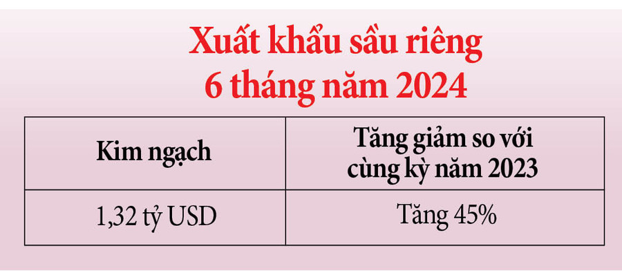 Trong 6 tháng đầu năm 2024, Trung Quốc là thị trường hàng đầu nhập khẩu sầu riêng của Việt Nam. Cụ thể, Trung Quốc đã chi 1,22 tỷ USD để nhập khẩu loại quả này từ Việt Nam (tăng 46% so với cùng kỳ năm 2023; chiếm 92,4% tổng kim ngạch xuất khẩu mặt hàng này của cả nước).
