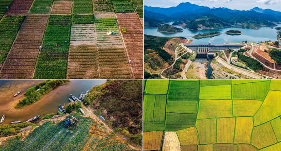 Hai bên bờ sông, sắc xanh của những cánh đồng lúa trải dài đến vô tận. Người dân tận dụng những đảo nhỏ bồi lấp giữa dòng sông, trồng các loại rau khác nhau. Những vườn rau xanh tươi hiện lên giữa dòng nước khiến phong cảnh càng trở nên hữu tình, thơ mộng, gần gũi.