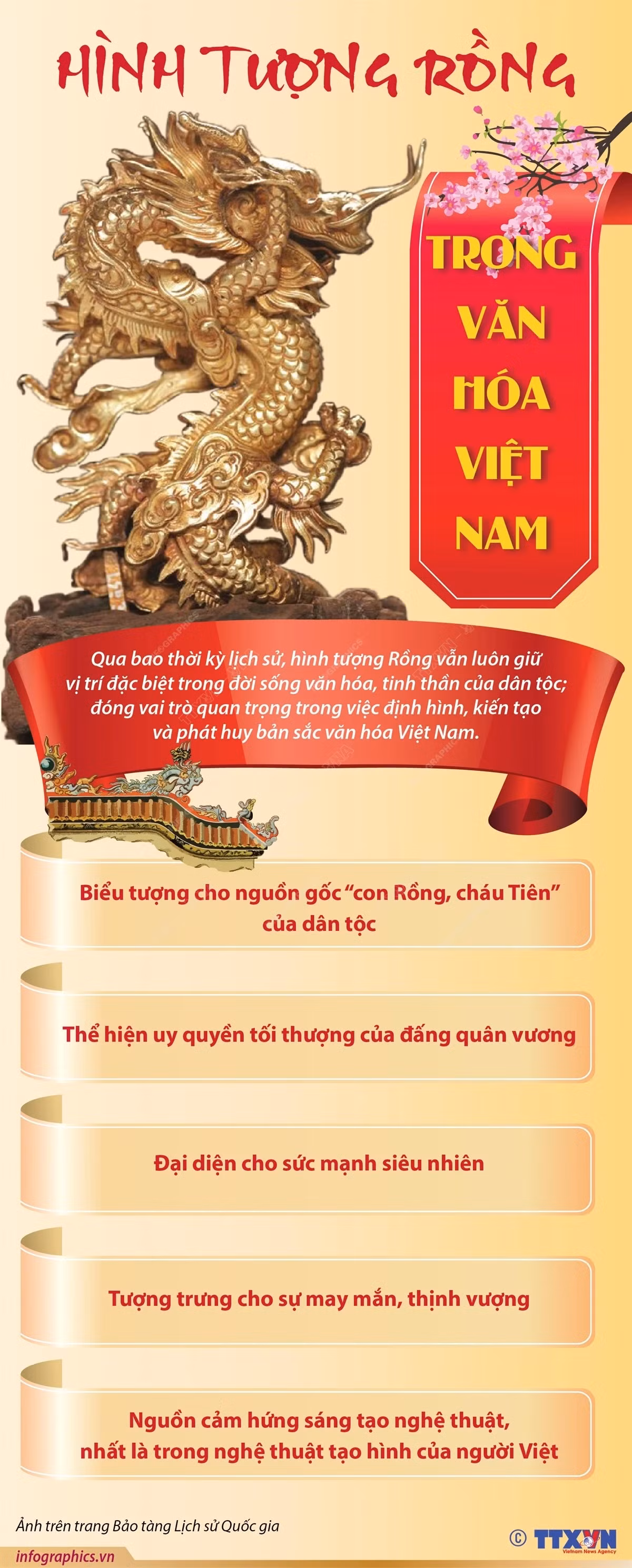 Trải qua các thời kỳ lịch sử, hình tượng Rồng tuy có sự tiếp biến, thay đổi một số đặc điểm nhưng vẫn được xem là biểu tượng văn hóa, được sử dụng rộng rãi trong mọi mặt đời sống xã hội từ trang trí kiến trúc cung đình đến kiến trúc dân gian, tôn giáo, tín ngưỡng và đồ dùng sinh hoạt hằng ngày...